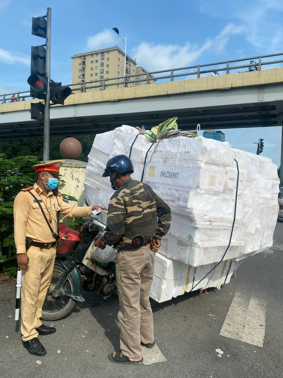Hồi 8h30', tổ công tác phát hiện anh Đ.Đ.T (sinh năm 1967, trú tại Hòa Đức, Hà Nội) điều khiển xe mô tô chở các tấm xốp vượt quá giới hạn quy định, che khuất hết tầm nhìn, gây mất an toàn giao thông. Tổ công tác đã tiến hành lập biên bản vi phạm hành chính với anh T do đã có hành vi vi phạm: Chở hàng hóa trên xe vượt quá giới hạn quy định", tạm giữ GPLX để xử lý đồng thời yêu cầu anh T phải tháo dỡ phần hàng chở quá trước khi tiếp tục tham gia giao thông.