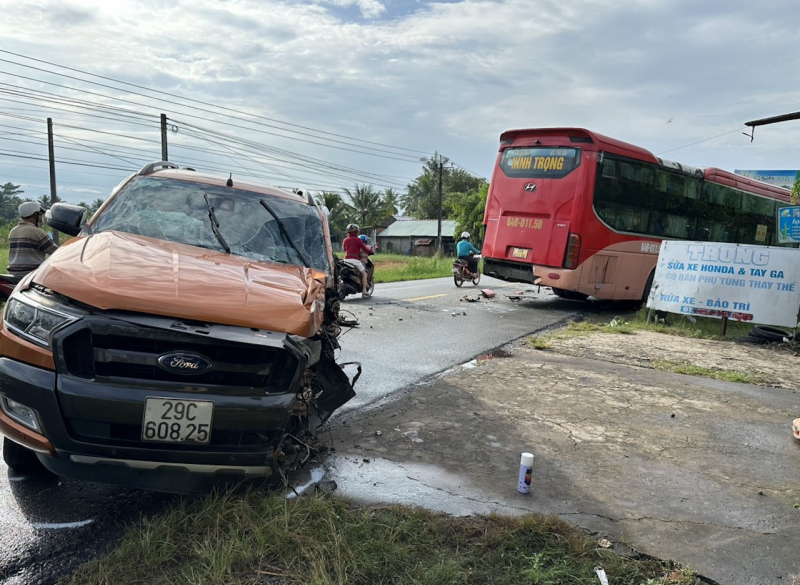 Vụ va chạm xảy ra trên quốc lộ 53 đoạn qua tỉnh Vĩnh Long khiến hành khách trên xe hốt hoảng, phần đầu hai phương tiện biến dạng, hư hỏng nặng.