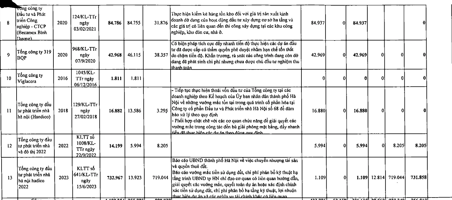 Các doanh nghiệp bị thanh tra, yêu cầu xử lý tài chính kể đến như: Tổng công ty Sông Đà, Tổng công ty Đầu tư phát triển hạ tầng UDIC, Tổng công ty Xây dựng Hà Nội (Hancorp), Tổng công ty Đầu tư phát triển nhà và đô thị (HUD), Tổng công ty IDICO-CTCP, Tổng công ty 319 BQP, Tổng công ty Viglacera, Tổng công ty đầu tư phát triển nhà Hà Nội (Handico), Becamex Bình Dương…