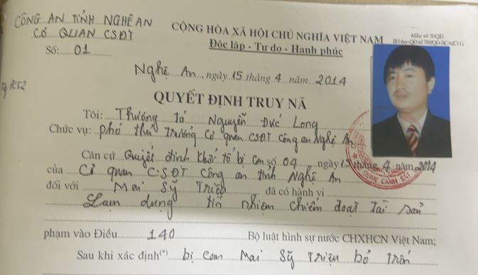 | Quyết định truy nã | Số 01 ngày 15/04/2014 |