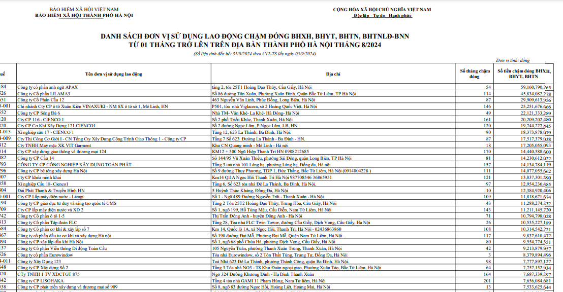 Bảo hiểm Xã hội TP Hà Nội vừa công bố danh sách đơn vị sử dụng lao động chậm đóng bảo hiểm xã hội, bảo hiểm y tế,… từ 1 tháng trở lên trên địa bàn TP Hà Nội tháng 8/2024 (số liệu tính đến hết 31/8/2024 theo C12-TS lấy ngày 5/9/2024).