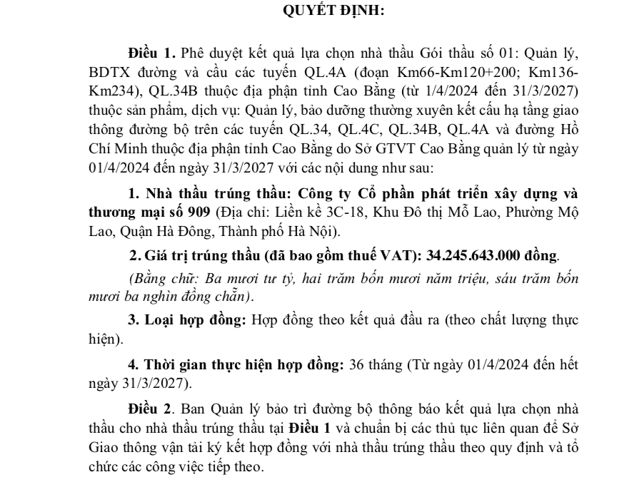 Trước đó vào ngày 30/3/2024, Công ty Xây dựng 909 “một mình một ngựa” trúng Gói thầu số 01 Quản lý, BDTX đường và cầu các tuyến QL.4A (đoạn Km66-Km120+200; Km136-Km234), QL.34B thuộc địa phận tỉnh Cao Bằng (từ 1/4/2024 đến 31/3/2027) do Sở Giao thông vận tải Cao Bằng làm chủ đầu tư. Giá trúng thầu hơn 34,245 tỷ đồng, giá gói thầu hơn 34,264 tỷ đồng, tỷ lệ tiết kiệm cho ngân sách chỉ 0,06%.