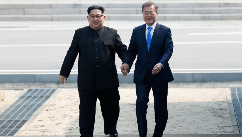 Nhà lãnh đạo Triều Tiên Kim Jong-un và Tổng thống Hàn Quốc Moon Jae-in gặp gỡ ở biên giới liên Triều, tháng 6/2018. Ảnh: AP