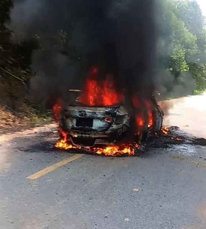 Theo đó, chiếc ô tô 5 chỗ đang di chuyển trên tỉnh lộ 538, khi đến khu vực dốc Truông Tràng bất ngờ phát hiện khói, lửa bốc lên từ dưới gầm xe. Rất may là tài xế cùng toàn bộ 5 người trên xe (gồm mẹ, vợ chồng tài xế và 2 người con) đã kịp thời thoát ra ngoài an toàn. Chỉ ít phút sau, chiếc xe đã bị thiêu rụi chỉ còn lại khung sắt.