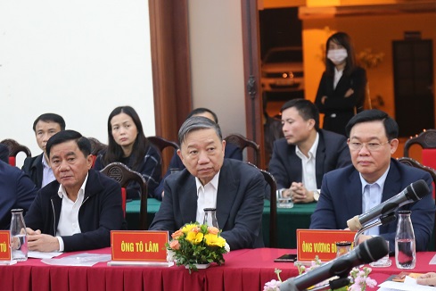 Đại tướng Tô Lâm, Bộ trưởng Bộ Công an và Bí thư Thành ủy Hà Nội Vương Đình Huệ tại hội nghị