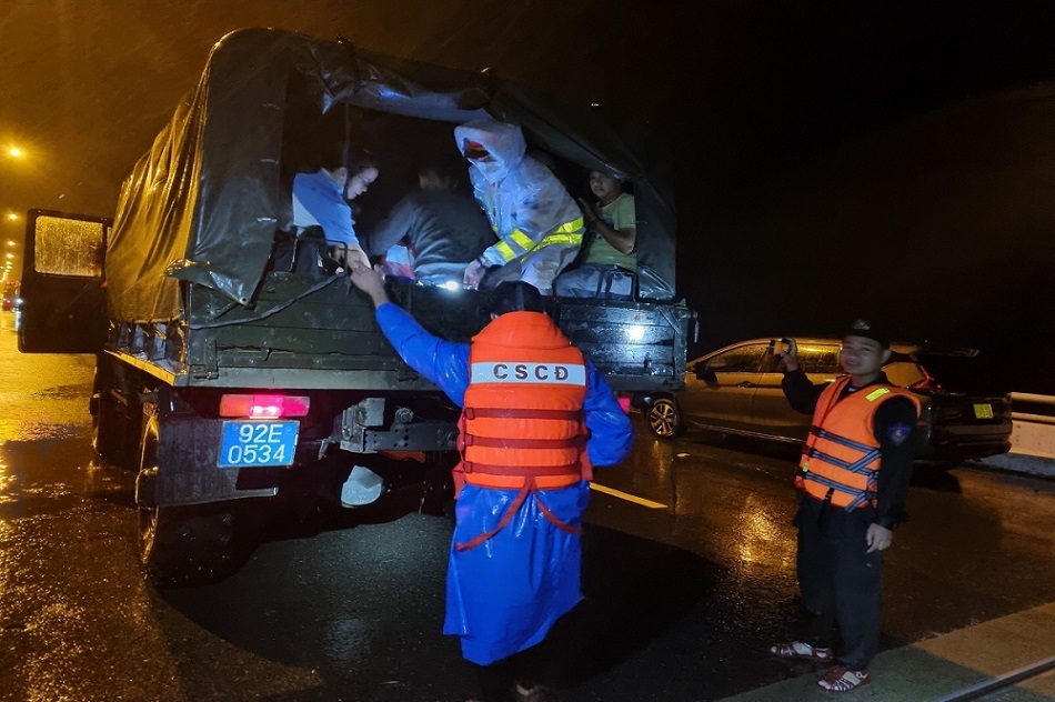 Trước đó, khoảng 20h tối 23/10, 22 người dân và hơn 10 phương tiện đang bị kẹt trước dòng nước lũ tại Km 985+998, trên tuyến QL1 đoạn qua xã Tam An (huyện Phú Ninh, Quảng Nam).
