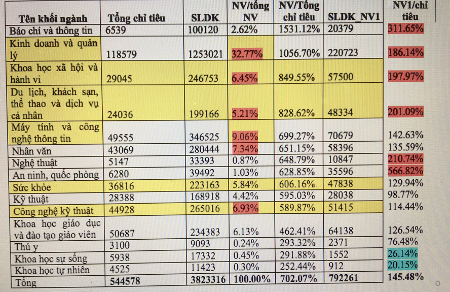 Theo đó, toàn hệ thống ghi nhận hơn 3,8 triệu nguyện vọng đăng ký, tổng chỉ tiêu tuyển sinh năm nay là gần 555.000 chỉ tiêu, tuy nhiên, đây là tổng số các nguyện vọng của thí sinh (từ nguyện vọng 1, nguyện vọng 2… ). Nếu tính tổng số nguyện vọng trên chỉ tiêu tuyển sinh thì số nguyện vọng gấp 7 lần chỉ tiêu, còn tính tổng số thí sinh đăng ký xét tuyển nguyện vọng 1 thì chỉ gấp 1,45 lần tổng số chỉ tiêu.