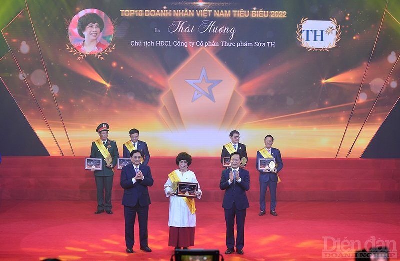 Thủ tướng Chính phủ Phạm Minh Chính và Chủ tịch VCCI Phạm Tấn Công trao bằng chứng nhận và cúp biểu trưng vinh danh cho TOP 10 Doanh nhân Việt Nam tiêu biểu 2022 cho bà Thái Hương, Chủ tịch Hội đồng chiến lược Công ty Cổ phần Thực phẩm Sữa TH.