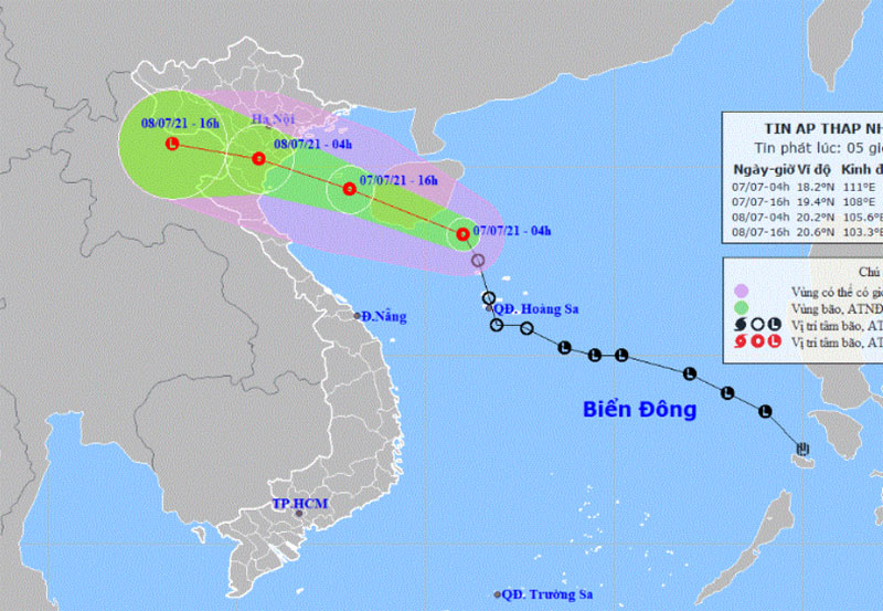 Dự báo trong 12 giờ tới, áp thấp nhiệt đới di chuyển theo hướng Tây Tây Bắc, mỗi giờ đi được khoảng 25 km và có khả năng mạnh thêm. Đến 16 giờ ngày 7/7, vị trí tâm áp thấp nhiệt đới ở khoảng 19,4 độ vĩ bắc; 18,0 độ kinh đông, trên khu vực Vịnh Bắc Bộ. Sức gió mạnh nhất vùng gần tâm áp thấp nhiệt đới mạnh cấp 7, 50-61 km/giờ, giật cấp 9.