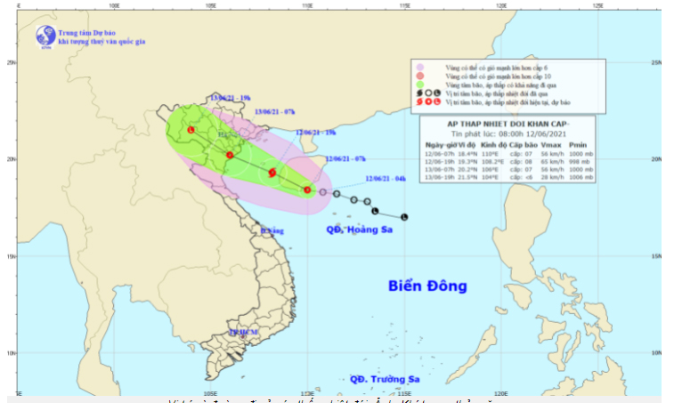 Theo Trung tâm Dự báo Khí tượng thủy văn quốc gia, hồi 7 giờ ngày 12/6, vị trí tâm áp thấp nhiệt đới ở vào khoảng 18,4 độ Vĩ Bắc; 110,0 độ Kinh Đông, trên khu vực phía Nam đảo Hải Nam (Trung Quốc). Sức gió mạnh nhất vùng gần tâm áp thấp nhiệt đới mạnh cấp 7 (50 - 60km/giờ), giật cấp 9.