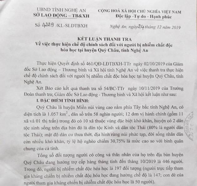Kết luận thanh tra số 4229/2019 của Sở LĐTB&XH Nghệ An về thực hiện chế độ, chính sách người bị nhiễm CĐHH trên địa bàn huyện Qùy Châu. Ảnh: Xuân Thống