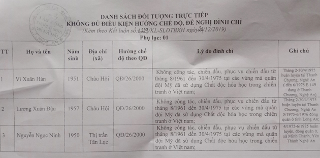 Cụ thể, từ tháng 4/2020 các ông Vi Xuân Hán (SN 1951) và Lương Xuân Đậu (SN 1957) đều trú ở xã Châu Hội, huyện Qùy Châu thuộc đối tượng đã hưởng chế độ theo QĐ 26/2000 bị dừng trợ cấp và chế độ ưu đãi hàng tháng. Còn lại ông Nguyễn Ngọc Ninh (SN 1950), trú ở Thị trấn Tân Lạc, huyện Qùy Châu vẫn là đối tượng đang được trả trợ cấp đối với người hoạt động kháng chiến bị nhiễm CĐHH.