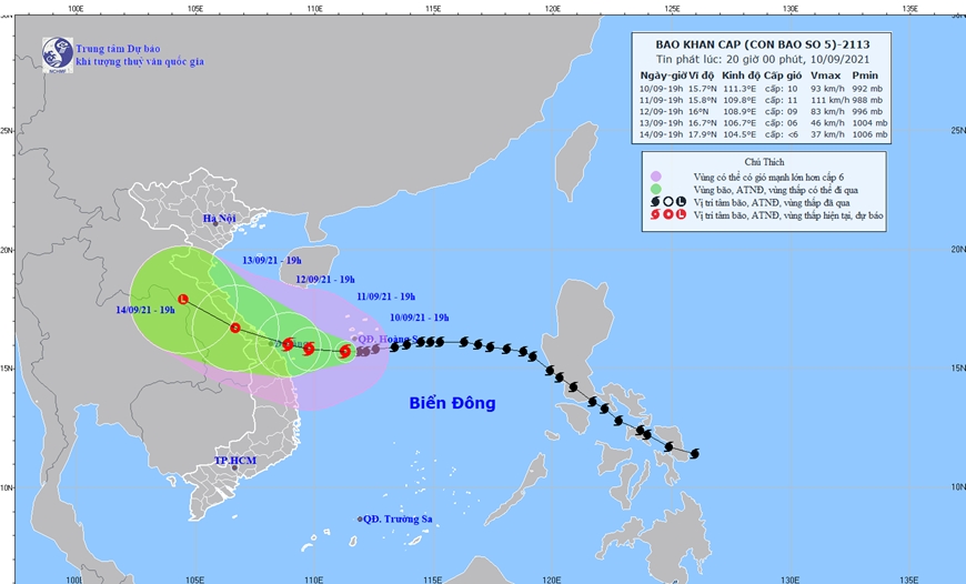Dự báo vị trí và hướng di chuyển của bão số 5 - Nguồn: Trung tâm Dự báo khí tượng thủy văn quốc giaDự báo trong 24 giờ tới, bão số 5 di chuyển chậm theo hướng Tây, mỗi giờ đi được 5 km. Đến 4 giờ ngày 12-9, vị trí tâm bão ở khoảng 15,8 độ Vĩ Bắc; 109,4 độ Kinh Đông, trên vùng biển khu vực từ Quảng Trị-Quảng Nam. Sức gió mạnh nhất vùng gần tâm bão mạnh cấp 9 (75-90 km/giờ), giật cấp 11.