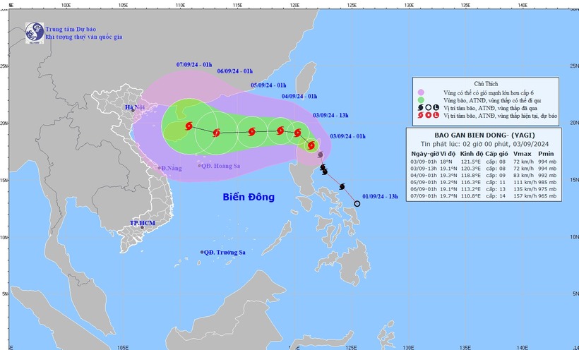 Dự báo khoảng chiều và đêm 3/9, bão Yagi đi vào Biển Đông. Từ trưa và chiều ngày 3/9, vùng biển phía đông bắc của khu vực bắc Biển Đông gió mạnh dần lên cấp 6, vùng gần tâm bão mạnh cấp 8, giật cấp 12; biển động mạnh.
