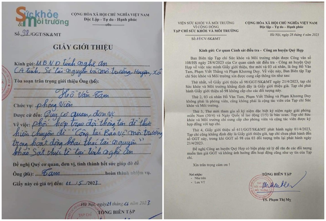 Các đối tượng đã xuất trình giấy giới thiệu được đề tên Tạp chí “Sức khỏe và môi trường” số 98/GGT/SK&MT gửi UBND tỉnh Nghệ An, Công an tỉnh, Sở Tài nguyên & Môi trường huyện, xã, giới thiệu Hồ Văn Tam làm việc. Giấy giới thiệu có ký tên, đóng dấu, đề tên Tổng biên tập là TS. Phạm Thị Mỵ. Hồ Văn Tam không xuất trình được thẻ phóng viên, thẻ nhà báo.