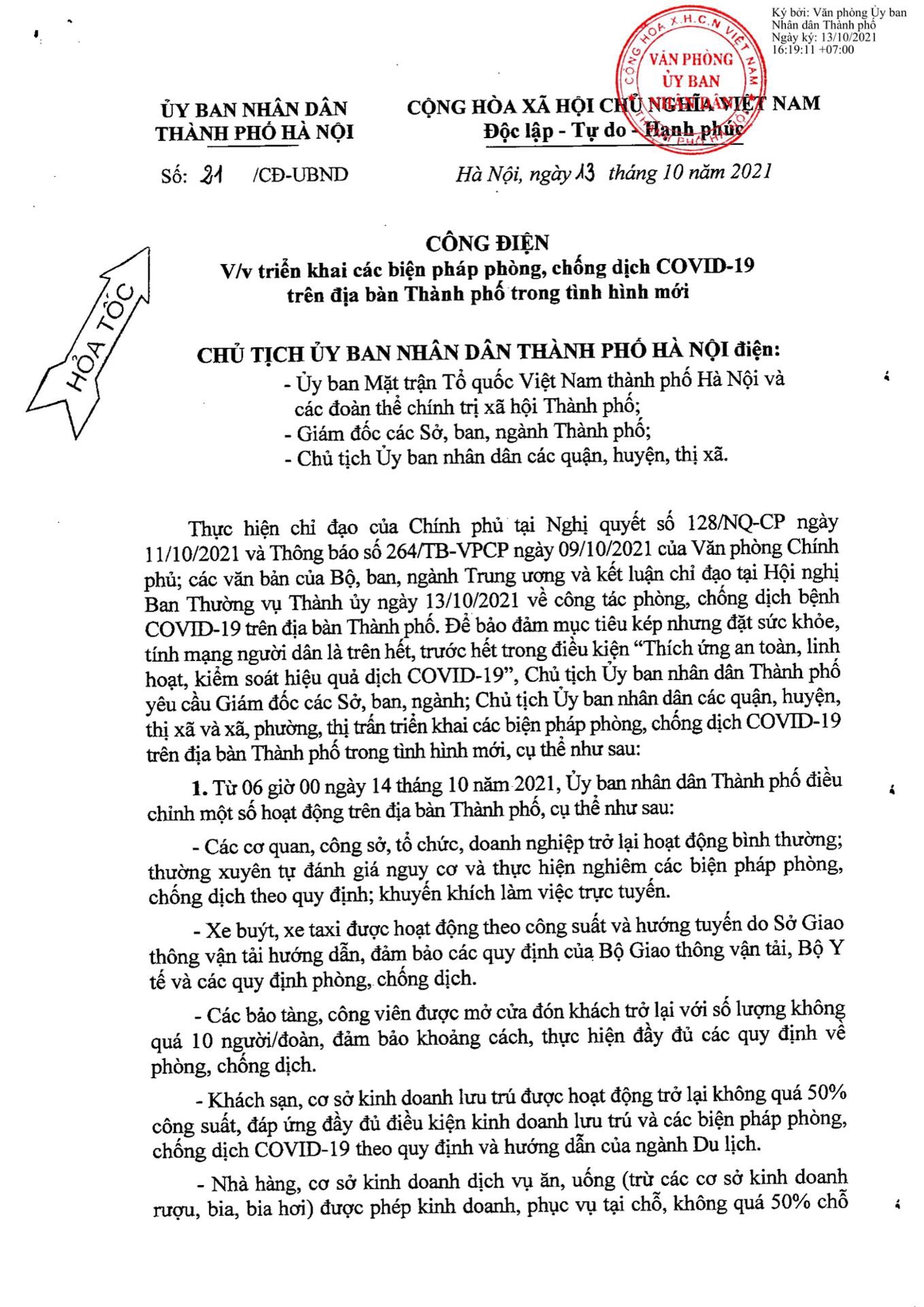 Theo đó, từ 06 giờ 00 ngày 14 tháng 10 năm 2021, Ủy ban nhân dân Thành phố điều chỉnh một số hoạt động trên địa bàn Thành phố, cụ thể như sau: