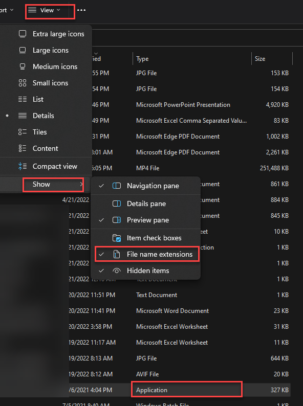 - Cách 1: Bật tính năng hiển thị định dạng tệp tin trên File Explorer, nếu tệp tin có biểu tượng là tệp tin .pdf, .docx, .xlsx, .mp4… nhưng thông tin tại cột Type là Application thì đây là tệp tin giả mạo.