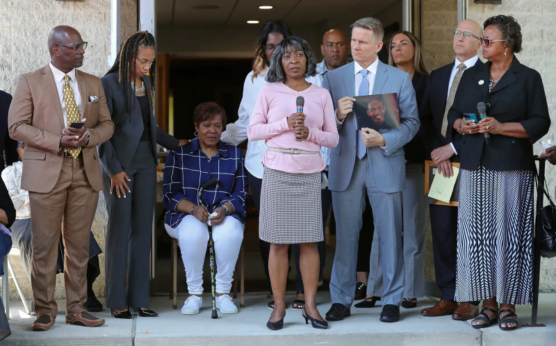 Mẹ của Jayland Walker, bà Pamela Walker (áo xanh đang ngồi), trong cuộc họp báo bên cạnh cách quan chức và nhà hoạt động ở Akron. Ảnh Akron Beacon Journal.