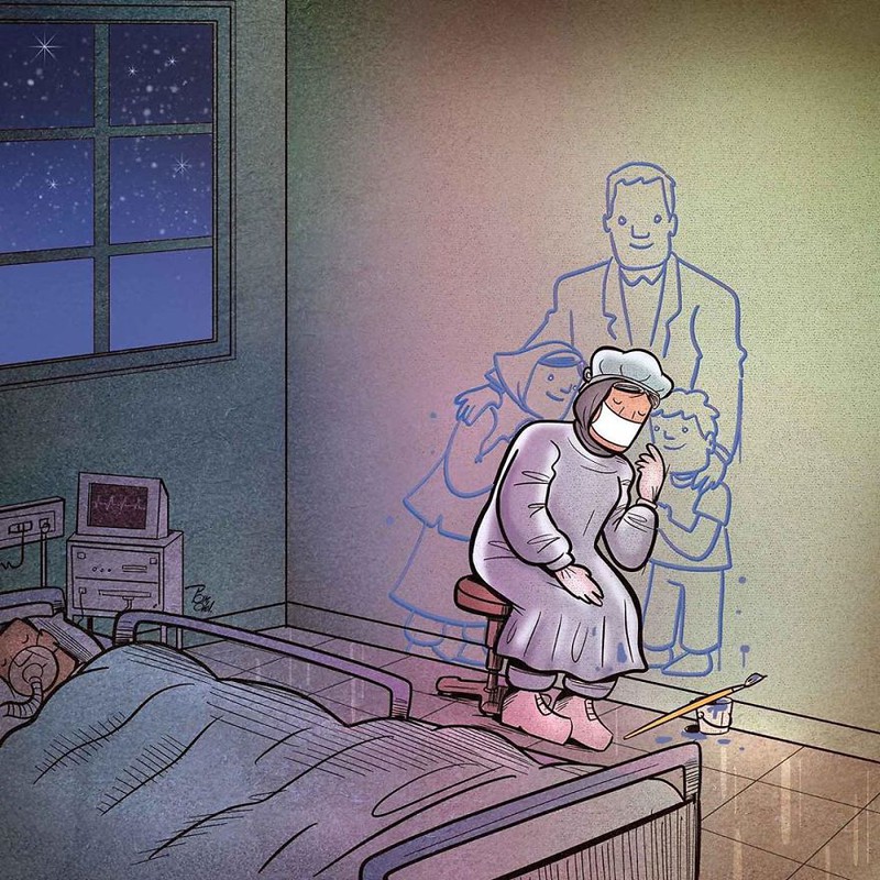 Thực tế khắc nghiệt của đại dịch Covid-19 đã được các họa sĩ tái hiện trong bộ tranh về đội ngũ y bác sĩ tuyến đầu đăng tải trên trang Boredpanda khiến người xem cảm động. Ngày đêm chăm sóc bệnh nhân, các bác sĩ phải xa gia đình trong thời gian dài.