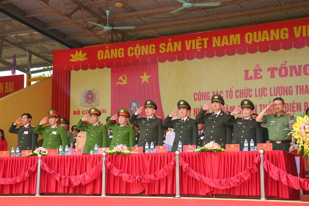 Đại tướng Tô Lâm, Uỷ viên Bộ Chính trị, Bộ trưởng Bộ Công an đến dự, phát biểu chỉ đạo, động viên tinh thần cán bộ, chiến sĩ đã làm tốt công tác đảm bảo an ninh, trật tự, tham gia diễu binh, diễu hành, đóng góp tích cực vào thành công chung của chuỗi các sự kiện Kỷ niệm 70 năm Chiến thắng Điện Biên Phủ.