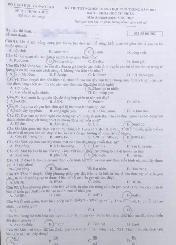 Ảnh minh hoạ: Mã đề thi số 202 môn Sinh học tại kỳ thi tốt nghiệp THPT năm 2021.