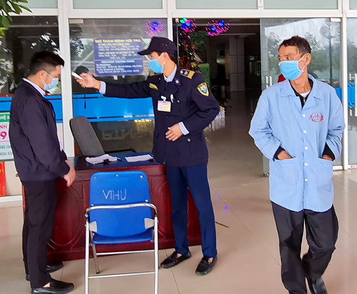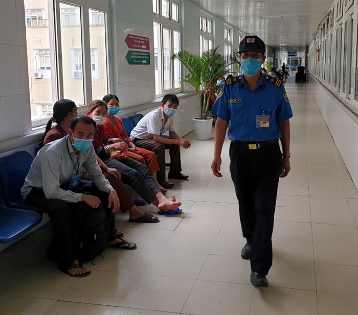 Vệ sĩ INVICO đang tuần tra nhắc nhở người nhà bệnh nhân treo khẩu trang tại Bệnh viện đa khoa tỉnh Nghệ An. Ảnh tư liệu