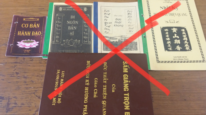 Không thực hiện theo đúng cam kết với chính quyền địa phương, Bá tiếp tục tụ tập nhiều người đến cầu nguyện, chữa bệnh với hình thức mê tín dị đoan như dùng “nước cúng” và ăn hoa quả để trị bệnh. Tài liệu mà Bá dùng để truyền “đạo” trái phép được Bá viết tay, photo thành nhiều bản và gọi là “sấm giảng” có tựa đề “Đức Phật Khùng”, những tài liệu này là do Bá tự biên soạn bằng cách vay mượn, cắt ghép giáo lý, giáo luật của nhiều đạo khác nhau như Phật Giáo, Cao Đài, Bửu Sơn Kỳ Hương, Hòa Hảo thành những câu thơ, vè để người đọc dễ thuộc, nghe mùi tai và tin theo.