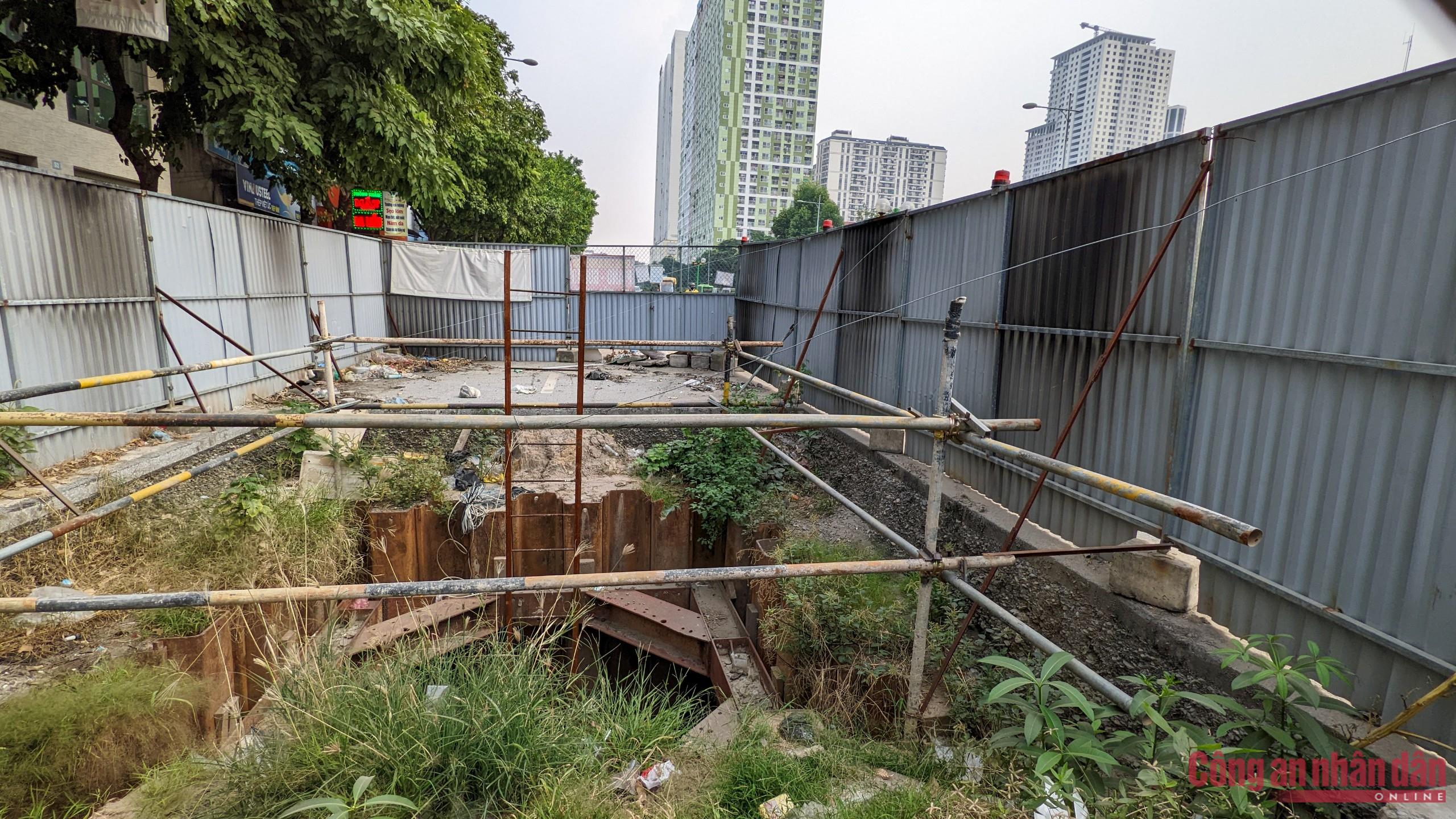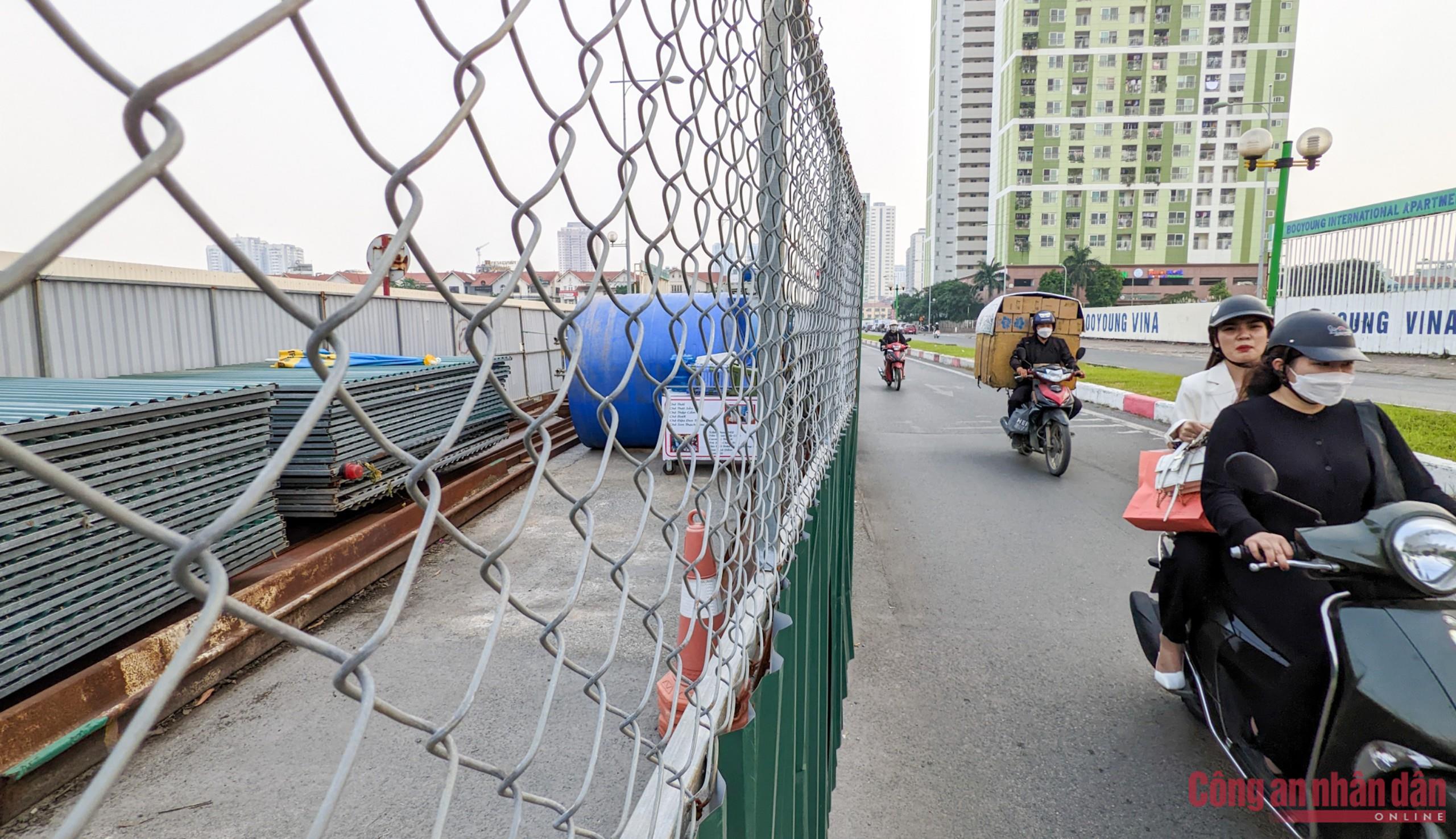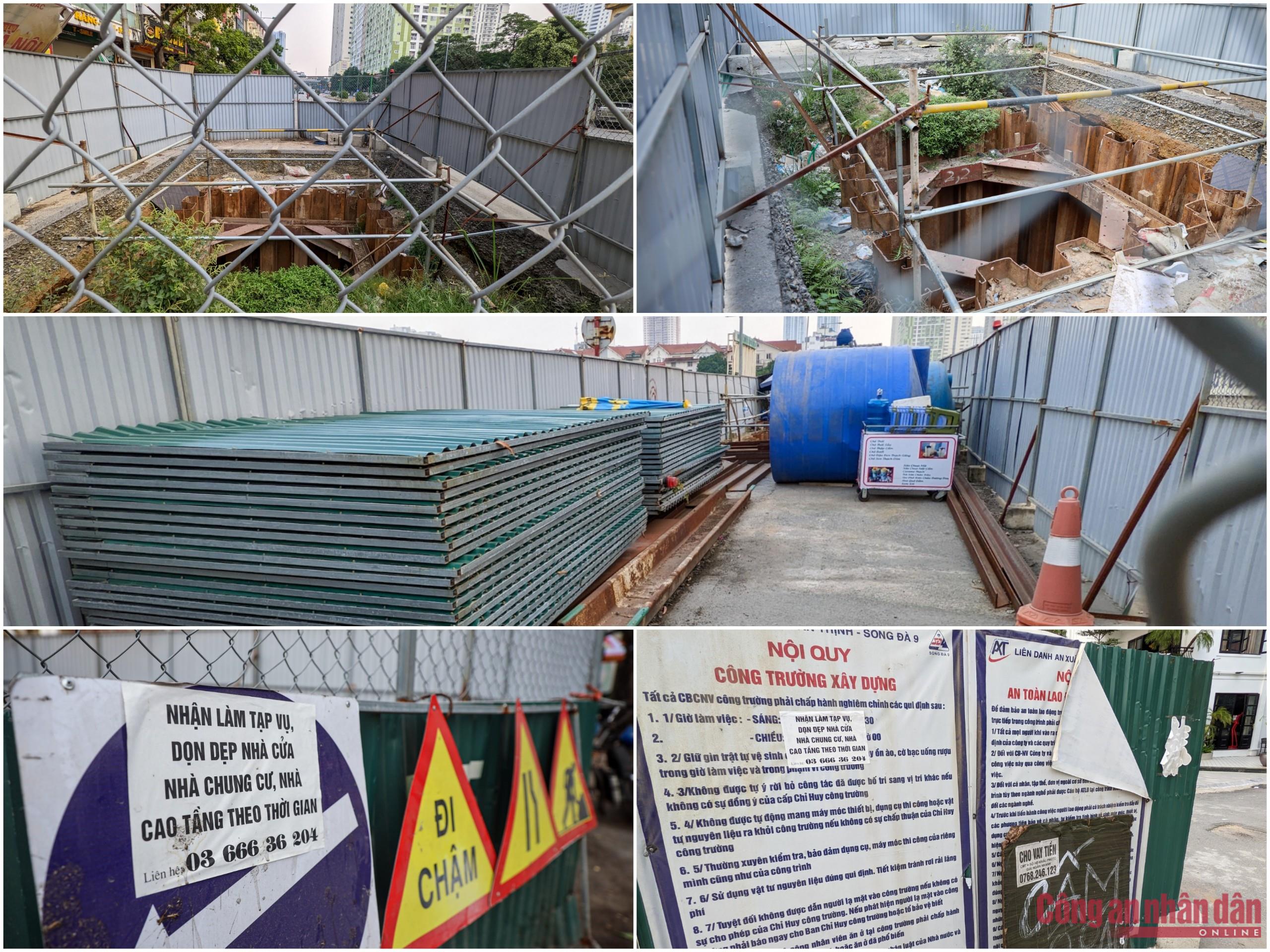Ghi nhận thực tế của PV CAND vào buổi sáng 8/11 cũng như chiều cùng ngày, tại tất cả các vị trí lập rào chắn trên đường Vũ Trọng Khánh đều không có công nhân thi công. Bên trong lô cốt chỉ có cỏ dại mọc cùng với đó là các khung sắt hoen gỉ còn phía bên ngoài hàng rào được người dân tận dụng dán quảng cáo, rất mất mỹ quan đô thị.