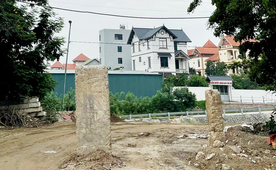 Lối vào bãi tập kết vật liệu của Công ty TNHH Thanh Hiền đã được UBND xã Hải Bối (huyện Đông Anh) chôn cọc bê tông, ngăn chặn vận chuyển cát, sỏi. Ảnh: Lê Tiến