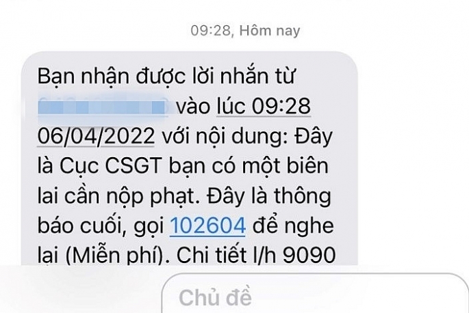 Cụ thể, nhiều người dân đã nhận nội dung tin nhắn “Bạn nhận được lời nhắn từ xxxxxxxxx vào lúc 09:28 06/04/2022 với nội dung: Đây là Cục CSGT bạn có một biên lai cần nộp phạt. Đây là thông báo cuối, gọi 102604 để nghe lại (Miễn phí). Chi tiết l/h 9090 (200đ/p)”.