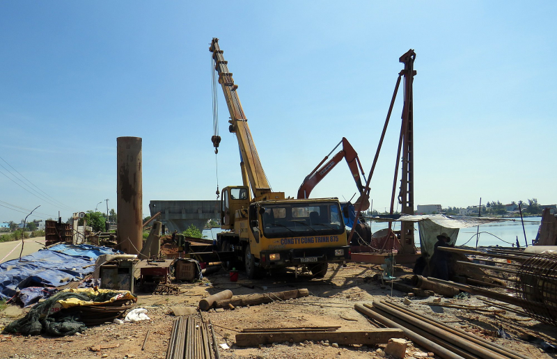 Công nhân tập trung thi công cầu Tam Giang phía thị trấn Núi Thành, huyện Núi Thành.