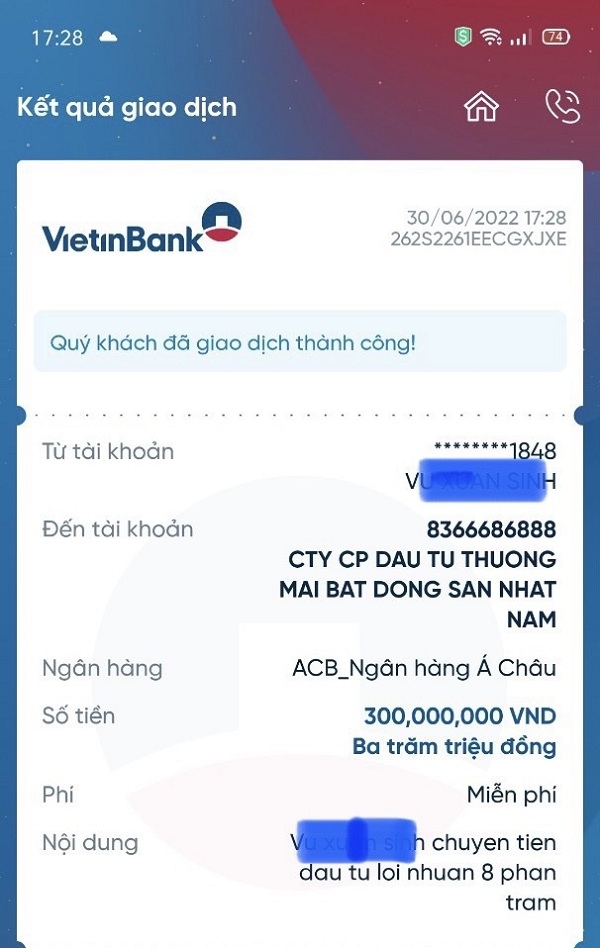 Anh S. đã dùng toàn bộ số tiền tiết kiệm của gia đình là 200 triệu đồng, cùng 300 triệu đồng đi vay mượn từ người thân để đầu tư vào Công ty Cổ phần đầu tư Thương mại Bất động sản Nhật Nam (Công ty Nhật Nam). Ngày 30/6/2022, tin tưởng và làm theo hướng dẫn của người có tên Phương, anh S. đã chuyển toàn bộ số tiền vào tài khoản 8366686888 được cho là của Công ty Nhật Nam tại ngân hàng ACB, mà không hề ký vào bất cứ giấy tờ cũng như bản hợp đồng nào.