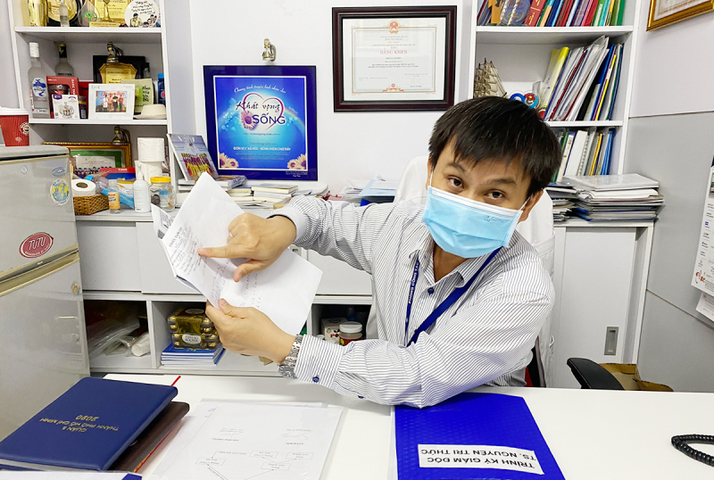 Thạc sỹ Lê Minh Hiển – Trưởng phòng Công tác xã hội Bệnh viện Chợ Rẫy cho xem hồ sơ thông tin người bệnh do đối tượng xấu cắt ghép rồi đăng lên mạng xã hội để lừa đảo.