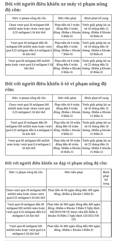 Chi tiết mức xử phạt vi phạm nồng độ cồn đối với người điều khiển ô tô, xe máy, xe đạp