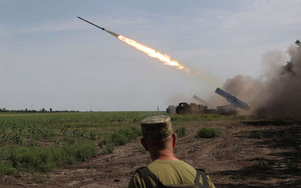 Pháo phản lực tự hành của quân đội Ukraine nhả đạn trên chiến trường. Ảnh: AFP.