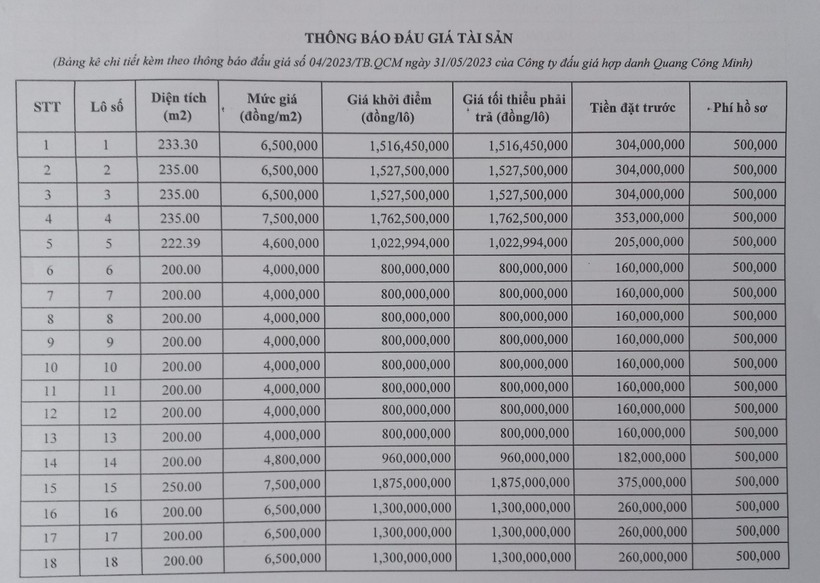Bảng kê một số lô đất trong khu đất đấu giá. (Ảnh: QCM)