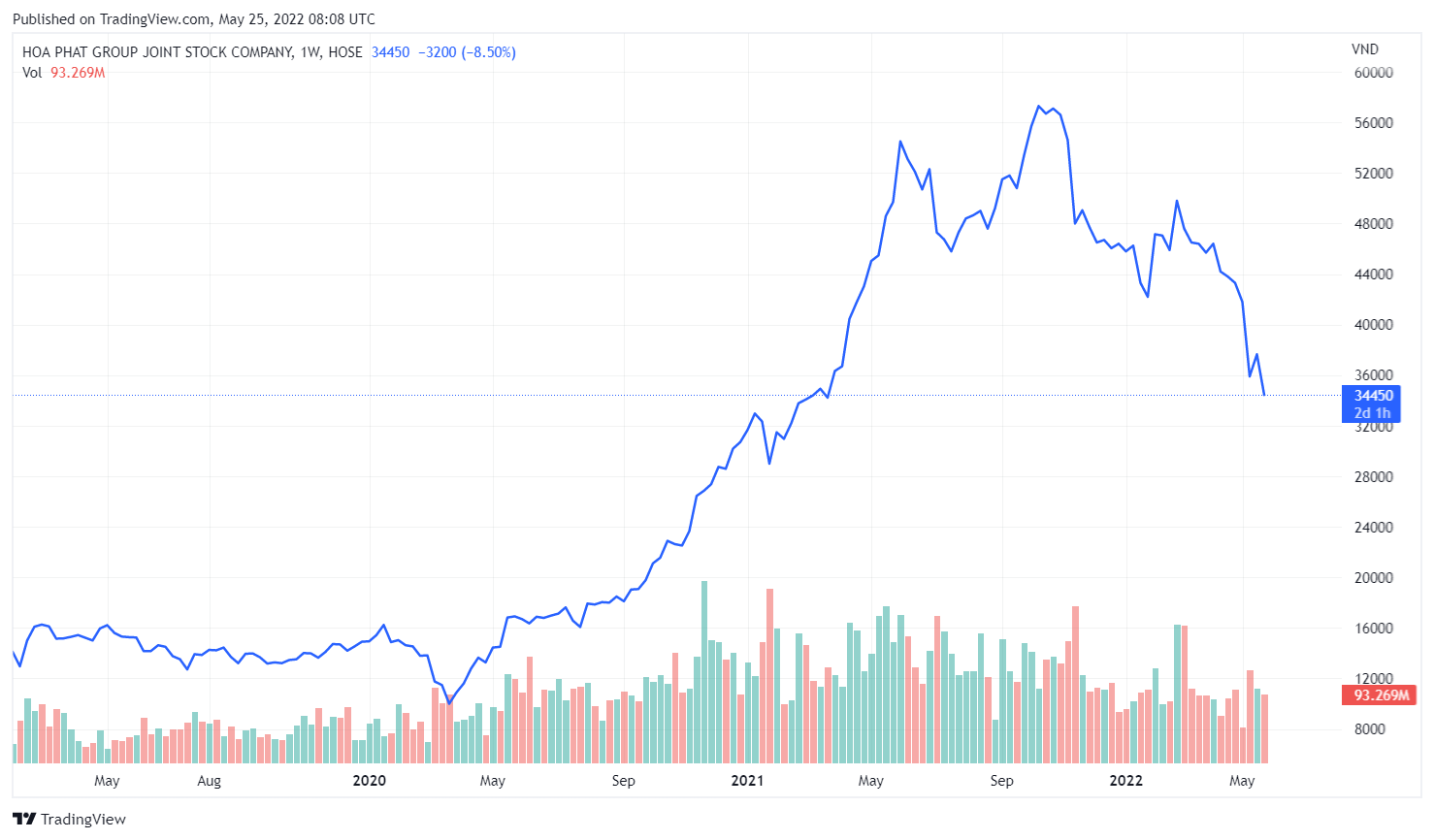 Nhưng đáng chú ý là cổ phiếu HPG của Tập đoàn Hòa Phát là mã duy nhất trong rổ VN30 giảm giá trong khi NKG, HSG đảo chiều tăng trở lại. Cụ thể, đóng cửa phiên 25/5, cổ phiếu HPG tiếp tục sụt giảm còn 34.450 đồng/cổ phiếu (-1,3%), mức thấp nhất từ đầu năm đến nay.