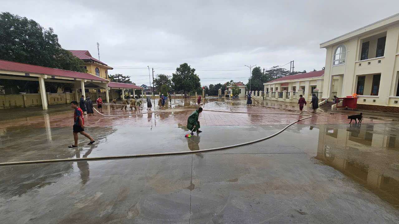Ngay sau khi nước rút, hàng chục cán bộ, chiến sĩ Công an huyện cùng với lực lượng đoàn viên thanh niên và đông đảo người dân địa phương đã bắt tay vào công tác dọn dẹp vệ sinh tại các khu vực bị ảnh hưởng nặng nề. Những con đường, nhà cửa ngập trong bùn đất được dội rửa; rác thải và cây cối đổ ngã đã được dọn dẹp với tinh thần đoàn kết, khẩn trương và quyết tâm cao.