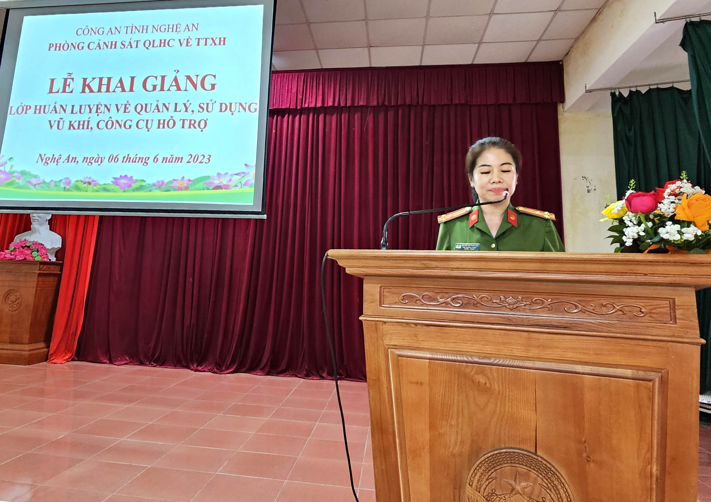 Sáng ngày 06 tháng 6 năm 2023, Phòng Cảnh sát Quản lý hành chính về trật tự xã hội Công an tỉnh Nghệ An (PC06) tổ chức buổi Lễ khai giảng lớp huấn luyện nghiệp vụ quản lý, sử dụng công cụ hỗ trợ (CCHT) cho các cơ quan, doanh nghiệp đóng trên địa bàn.