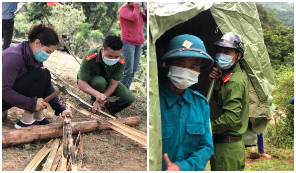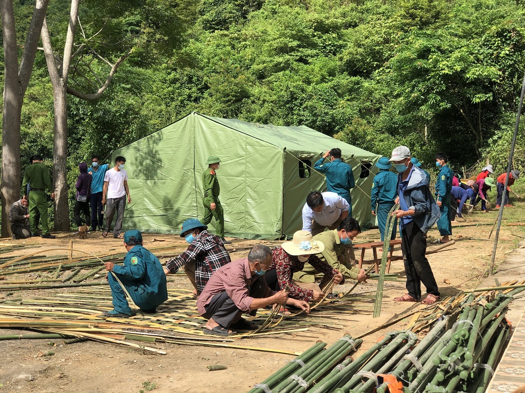 Công an xã Phà Đánh cùng các ban, ngành, đoàn thể và Nhân dân tiến hành dựng 02 lán trại dã chiến