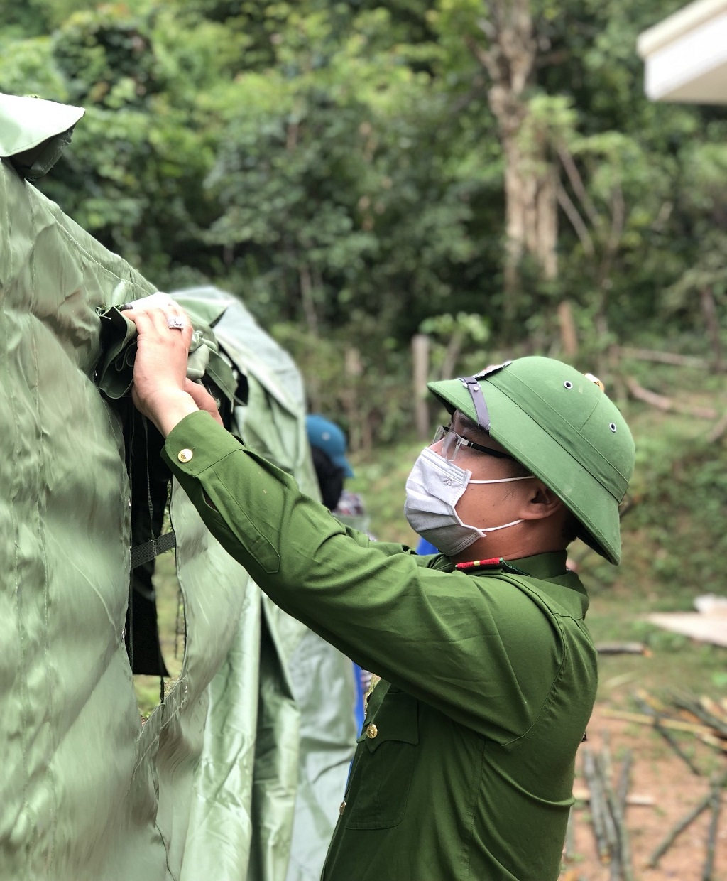 Cán bộ Công an xã Phà Đánh, huyện Kỳ Sơn “đội nắng, lội mưa” lập lán trại tại điểm cách ly Covid-19