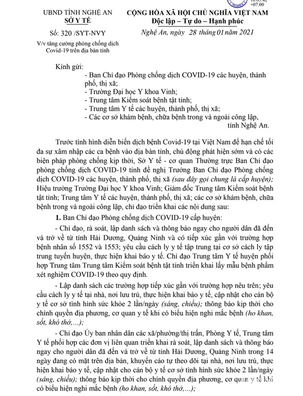 Công văn của Sở Y tế Nghệ An về việc tăng cường phòng, chống dịch Covid-19 trên địa bàn tỉnh.