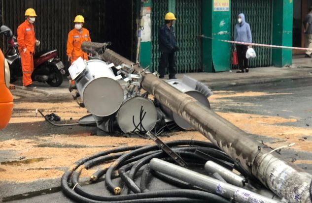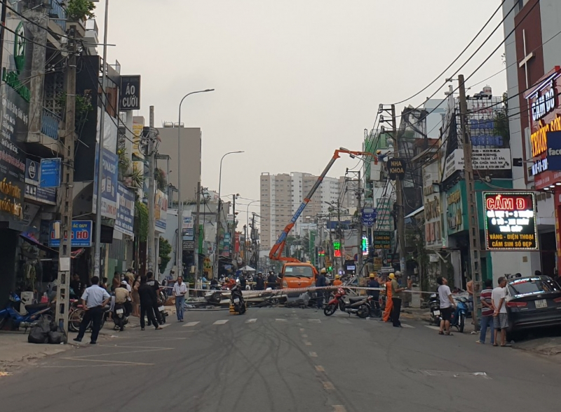 Khoảng 16h ngày 16/4, nhiều người dân lưu thông hoảng hốt tháo chạy khi cột điện hạ thế nằm trước một công trình đang xây dựng, số 916, đường Lạc Long Quân, phường 8, quận Tân Bình, TP Hồ Chí Minh bất ngờ đổ ra đường. Trong lúc đổ, các dây điện bị chạm chập tạo ra tiếng nổ.