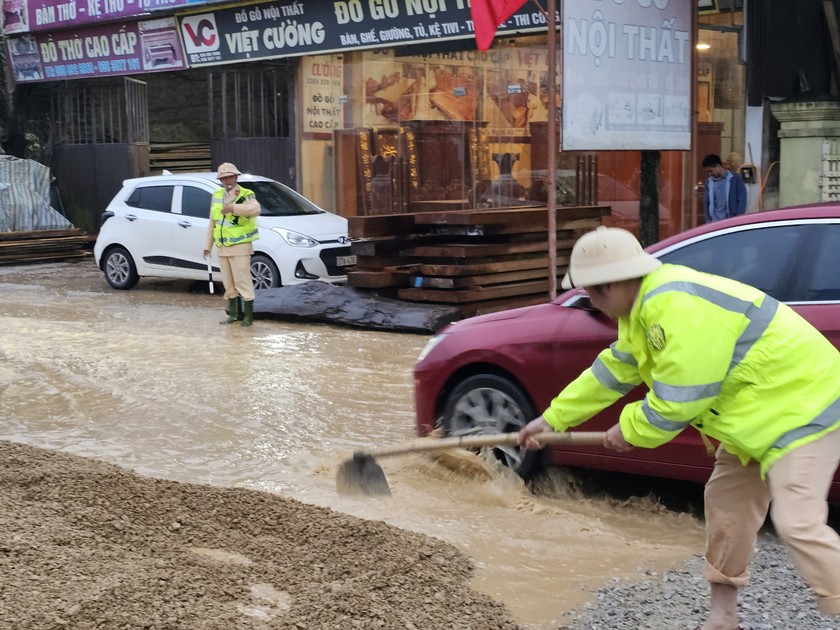 Cụ thể, Tổ công tác đã liên hệ đơn vị thi công công trình, huy động máy bơm công suất lớn để hút nước, đổ đá lót đường. Các CSGT đồng thời dùng cuốc, xẻng cào đá lấp chỗ trũng và phân luồng giao thông giúp các phương tiện lưu thông thuận lợi hơn.