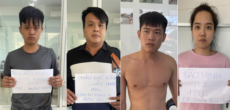 Các đối tượng bị bắt giữ gồm Châu Đức Minh Luân (SN 1992; trú tại Quận Bình Tân), Nguyễn Hoàng Duy Khương (SN 2005), Nguyễn Đình Phong (SN 1996) và Đào Minh Trúc (SN 1991; cùng trú tại phường 11, quận Bình Thạnh, TP Hồ Chí Minh).