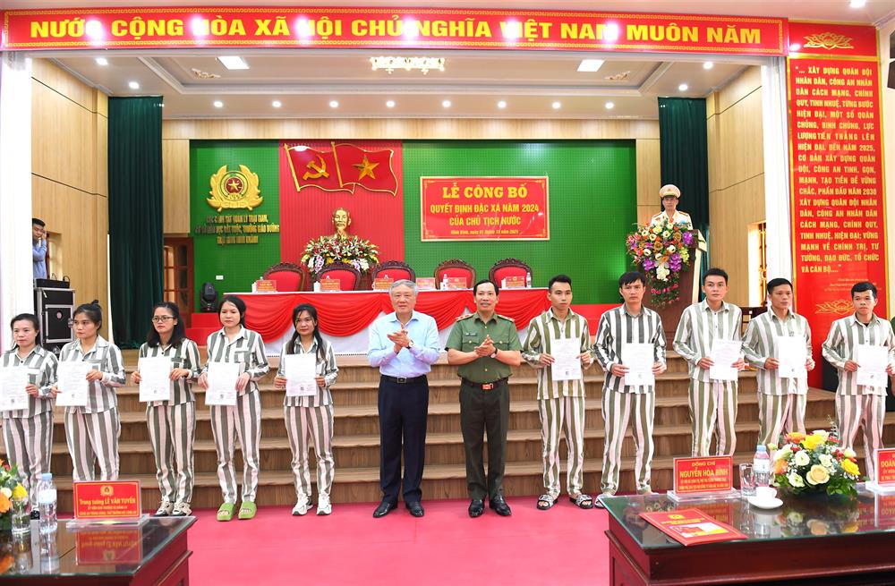 Tại buổi Lễ, Phó Thủ tướng Thường trực Chính phủ Nguyễn Hòa Bình và Thứ trưởng Lê Văn Tuyến đã trao giấy chứng nhận đặc xá cho đại diện phạm nhân được đặc xá năm 2024.