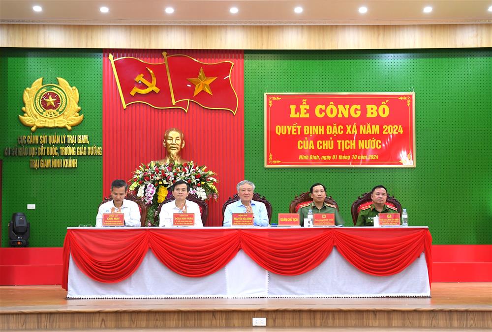 Ngày 01/10/2024, tại tỉnh Ninh Bình, đồng chí Nguyễn Hòa Bình, Ủy viên Bộ Chính trị, Phó Thủ tướng Thường trực Chính phủ, Chủ tịch Hội đồng tư vấn đặc xá năm 2024 đến dự Lễ công bố Quyết định đặc xá năm 2024 của Chủ tịch nước tại Trại giam Ninh Khánh thuộc Cục Cảnh sát quản lý trại giam, cơ sở giáo dục bắt buộc, trường giáo dưỡng, Bộ Công an.