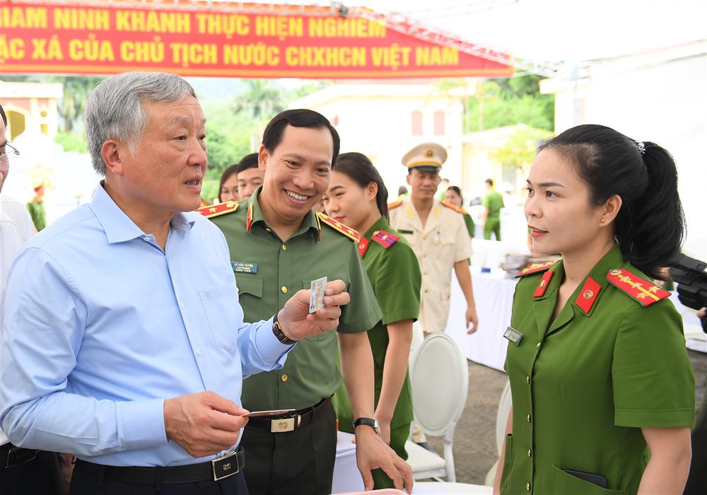 Phó Thủ tướng Thường trực Chính phủ Nguyễn Hòa Bình và Thứ trưởng Lê Văn Tuyến kiểm tra nơi cấp thẻ căn cước cho các trường hợp được đặc xá.
