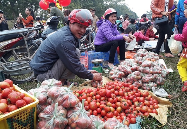 Những mặt hàng được bày bán ở chợ chủ yếu là những nông sản đặc trưng của vùng và những món ăn dân gian truyền thống như: bánh đa gấc, bánh cuốn, táo, rau các loại… Trong đó, cà chua là một loại hàng hóa đặc biệt được bán rất nhiều để làm… vũ khí ném nhau.