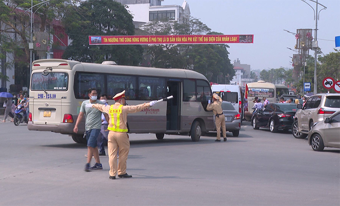 Công an tỉnh Phú Thọ đã bố trí lực lượng, phương tiện phân luồng, điều tiết giao thông, hướng dẫn người dân đi vào khu vực lễ hội và các bãi để xe ô tô, mô tô.